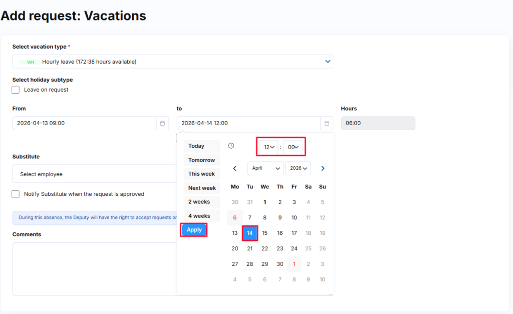 In the From and To fields, select the first and last day of your absence from the calendar, then specify the hours – i.e. the start and end time for each day you will be absent. Once you have set the date and time, click Apply to confirm your selection. The Hours field will fill in automatically – the system calculates the total number of hours by multiplying the number of working days by the specified time range.