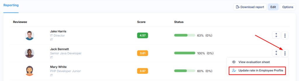- Click the three-dot menu next to the employee whose profile you wish to update
